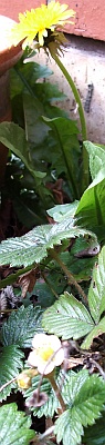 It's still frost and my strawberry is flowering, as is the dandelion.